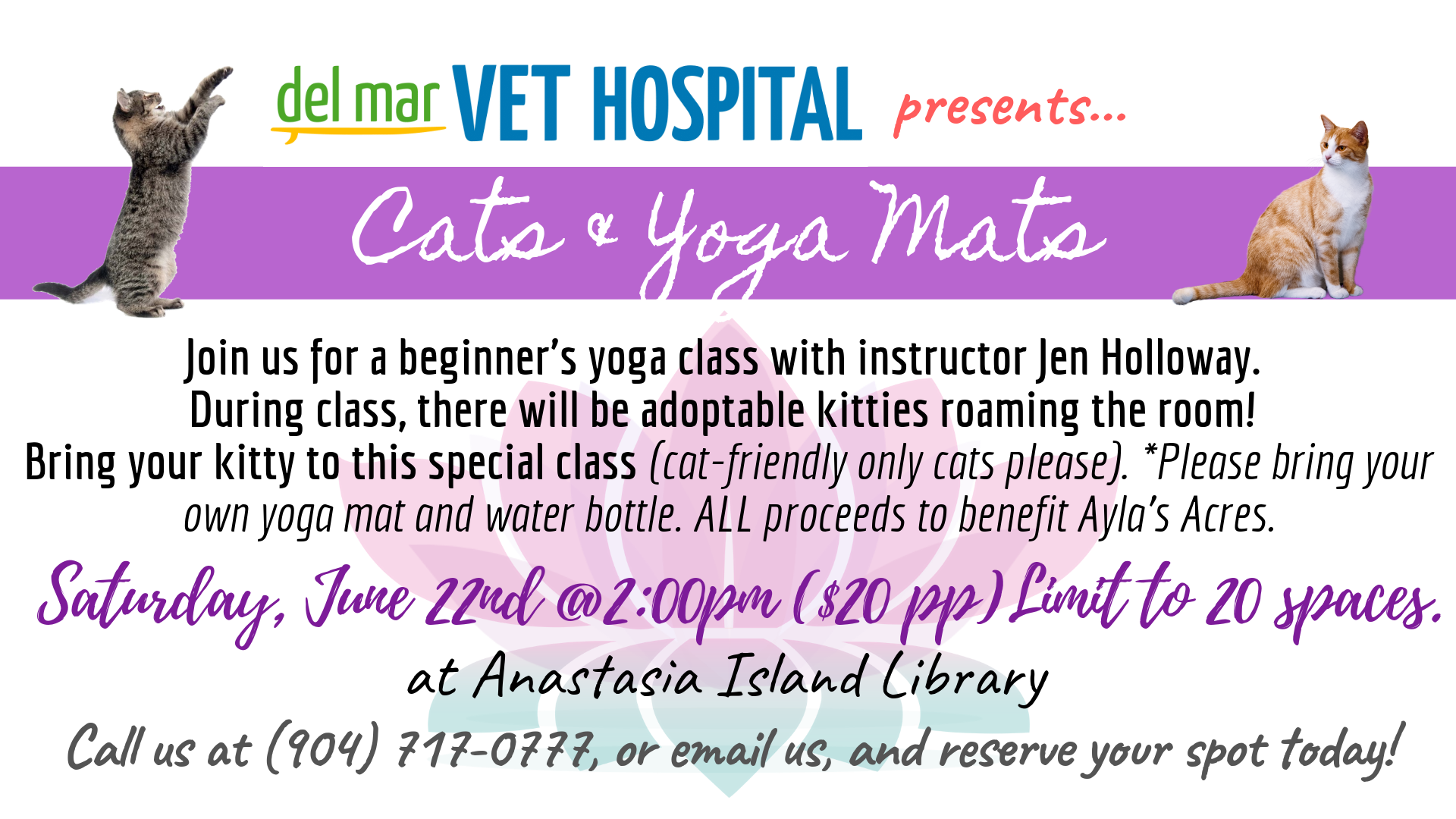Donation: $20.00 per person (please bring cash the day of the event). All of the proceeds will go to Ayla’s Acres No-Kill Animal Rescue. Limit to 20 participants ***Please bring your own yoga mat and water bottle. ***