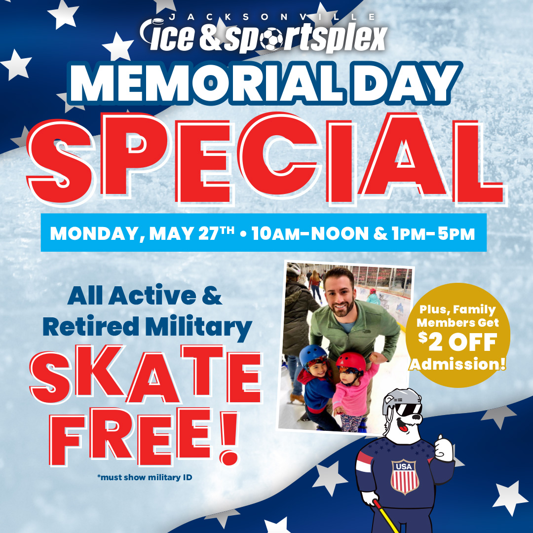 Skate into the three day weekend by celebrating memorial day at Jacksonville Ice! On Monday, May 27th from 10 am – noon and 1 pm – 5 pm, all active and retired military skate free with a military ID. Family members get $2 off admission!