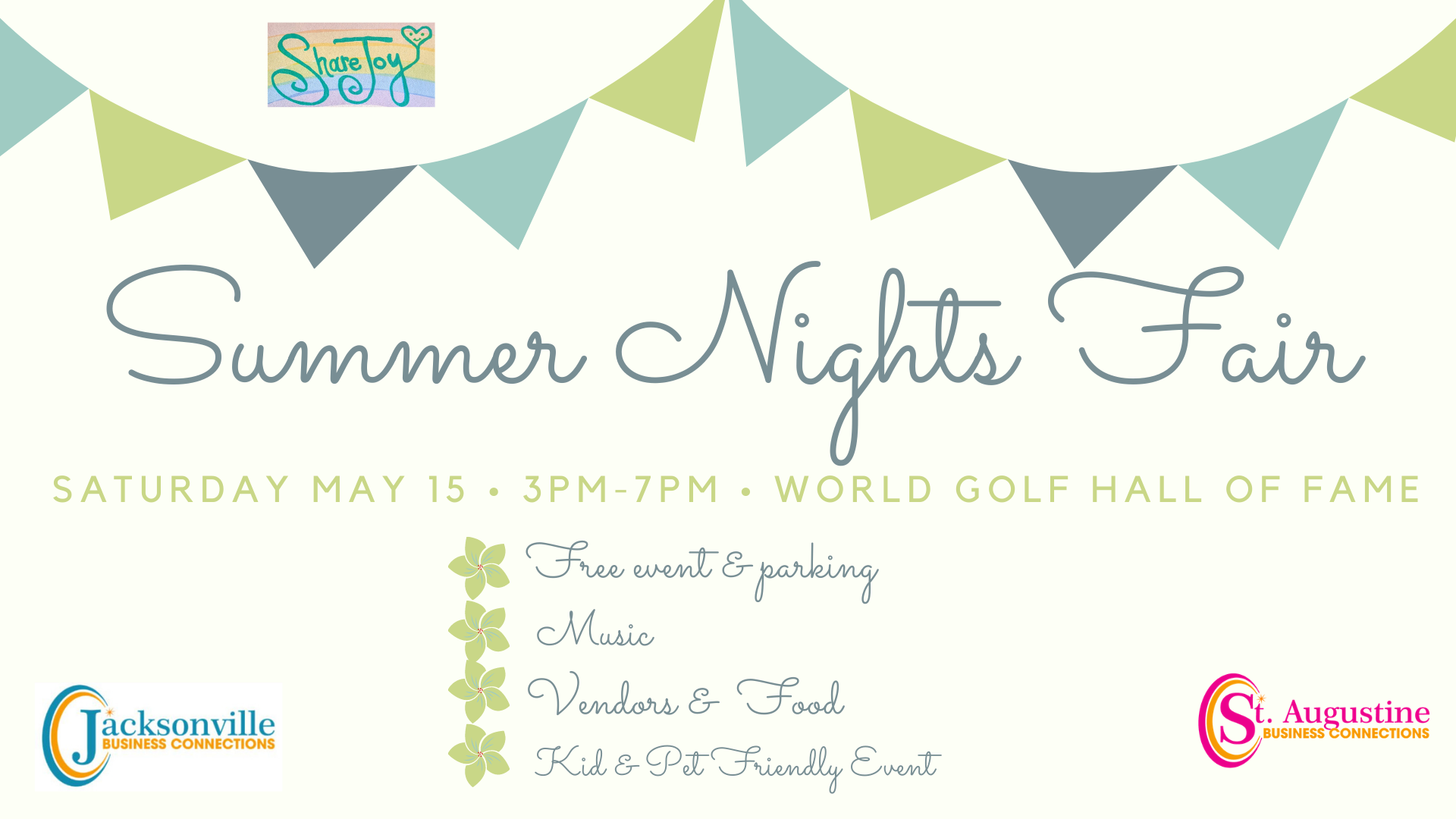 St. Augustine Business Connections invites you to our Summer Nights Fair featuring local creatives and retailers at the World Golf Hall of Fame May 15th from 3-7pm. We hope to see you there!