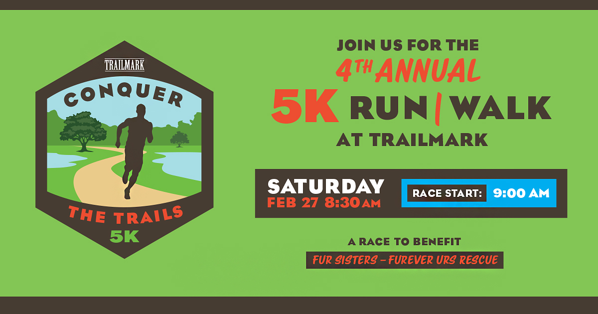 Join TrailMark for Conquer the Trails 5K on Saturday, Feb. 27, 2021. The race starts at 9 a.m. Pre-race opens at 8:30 a.m. All proceeds will be donated to Fur Sisters – Furever Urs Rescue.