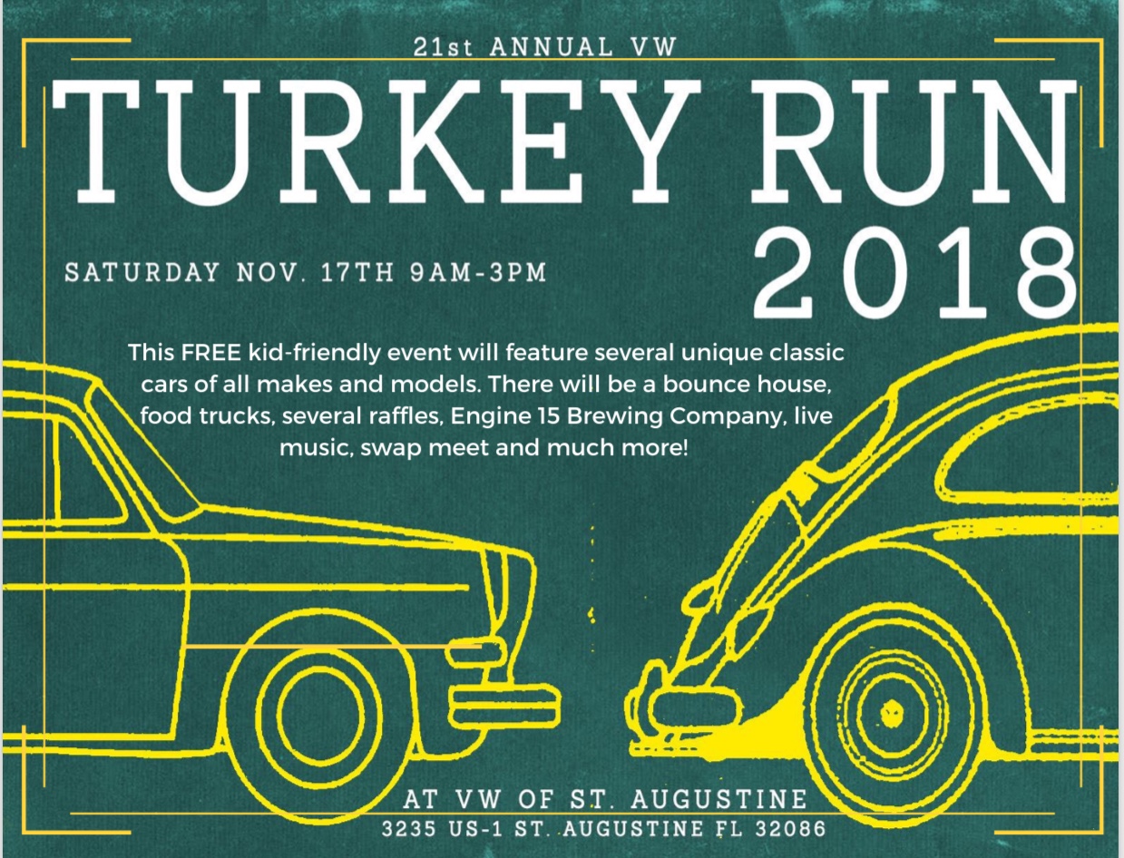Turkey Run hosted by VW of St. Augustine and the Old City Oil Drippers is a free annual car show that is fun for the whole family. Bring out your vintage or newer model VW or just come by and enjoy the bounce house, DJ, Food, Raffle and car contest. This event will raise funds with the sales of tee shirts and posters for the family of former Old City Oil Drippers Designer and member John Boswell who passed away suddenly last year at the age of 40 leaving behind his wife and two children.