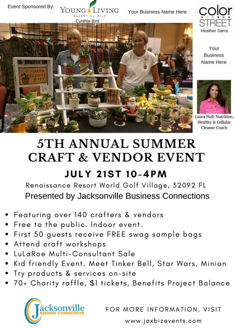 Jacksonville Business Connections is excited to host our 5th Annual Summer Craft & Vendor Event – Free to the Public featuring 139 vendors and crafters at the Renaissance World Golf Village Resort July 21st from 10am-4pm