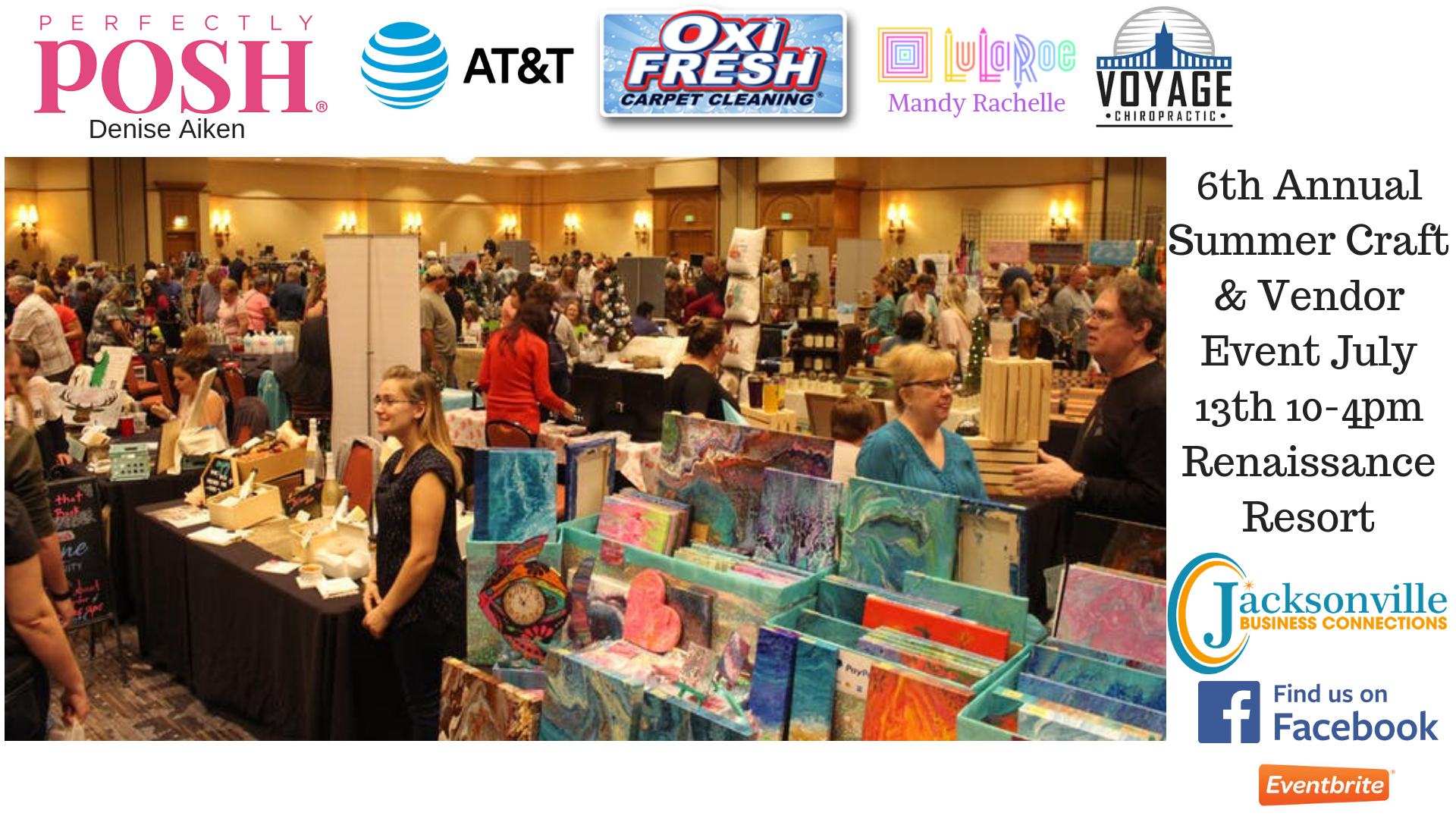 Jacksonville Business Connections is excited to host our 6th Annual Summer Craft & Vendor Event featuring over 140 vendors and crafters at the Renaissance World Golf Village Resort July 13th from 10am-4pm