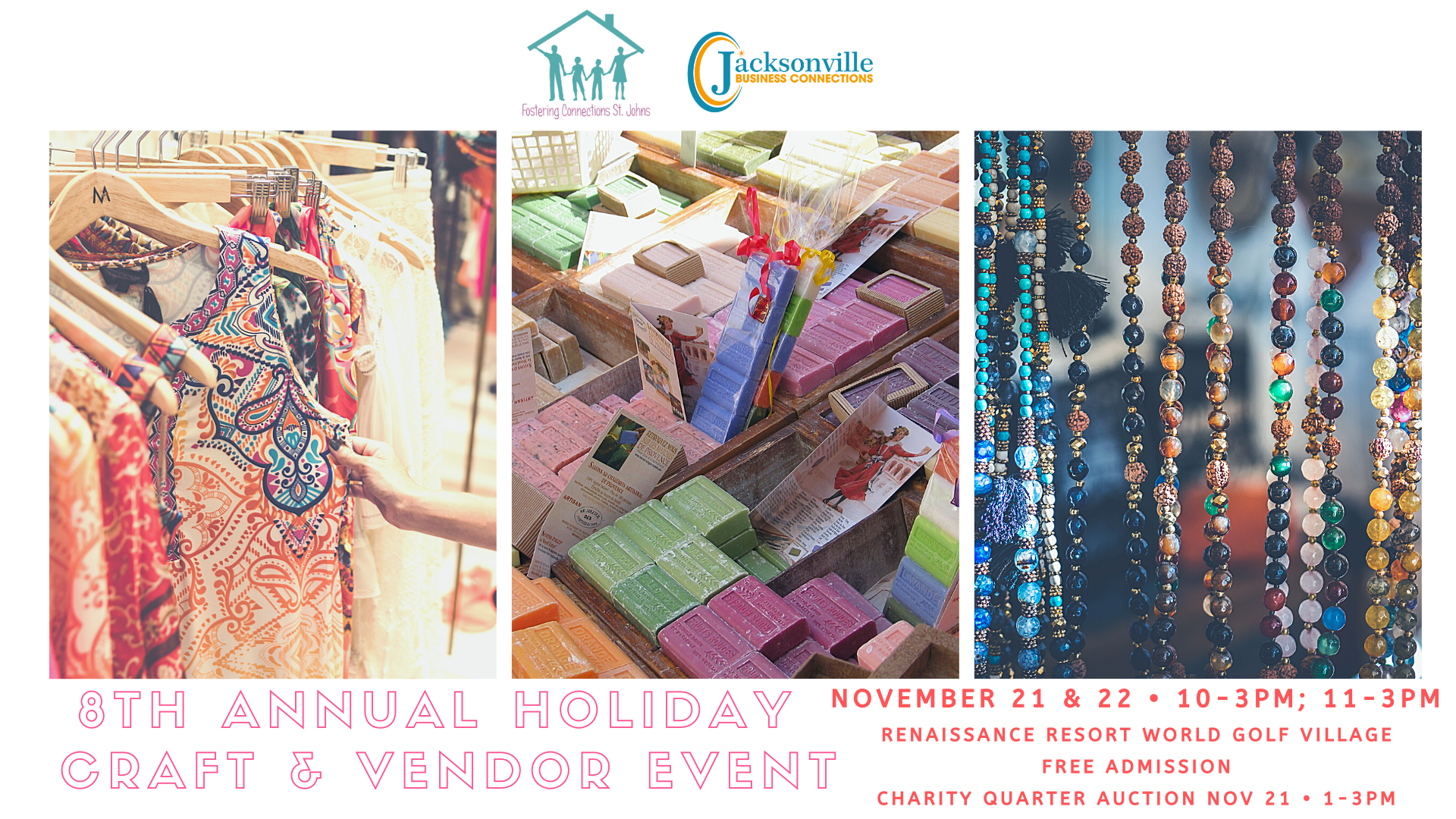 Jacksonville Business Connections invites you to our 8th Annual Holiday Craft & Vendor Event featuring 150 creatives and retailers at the Renaissance World Golf Village Resort Nov 21st from 10am-3pm & Nov 22nd from 11-3pm.. We hope to see you there!