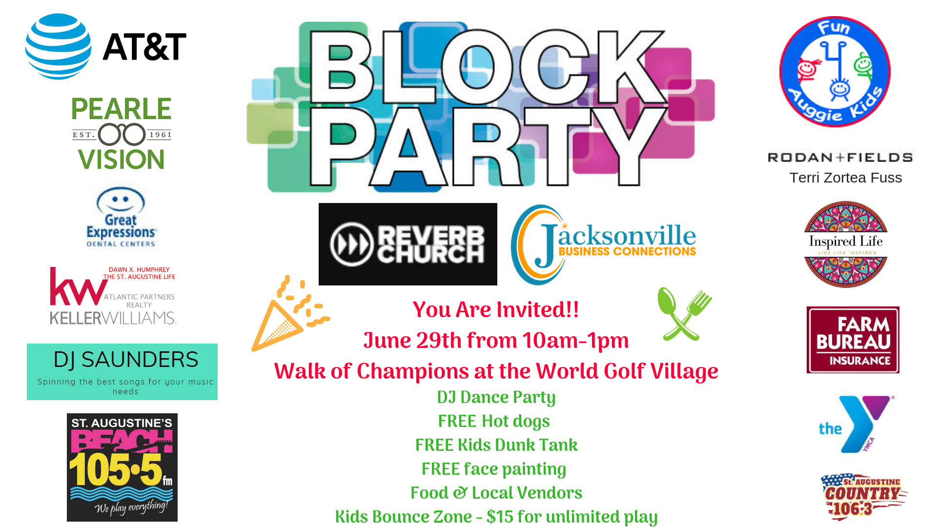 Jacksonville Business Connections invites you to our Block Party Community Event on June 29 from 10am-1pm at the Hall of Fame at the World Golf Village.