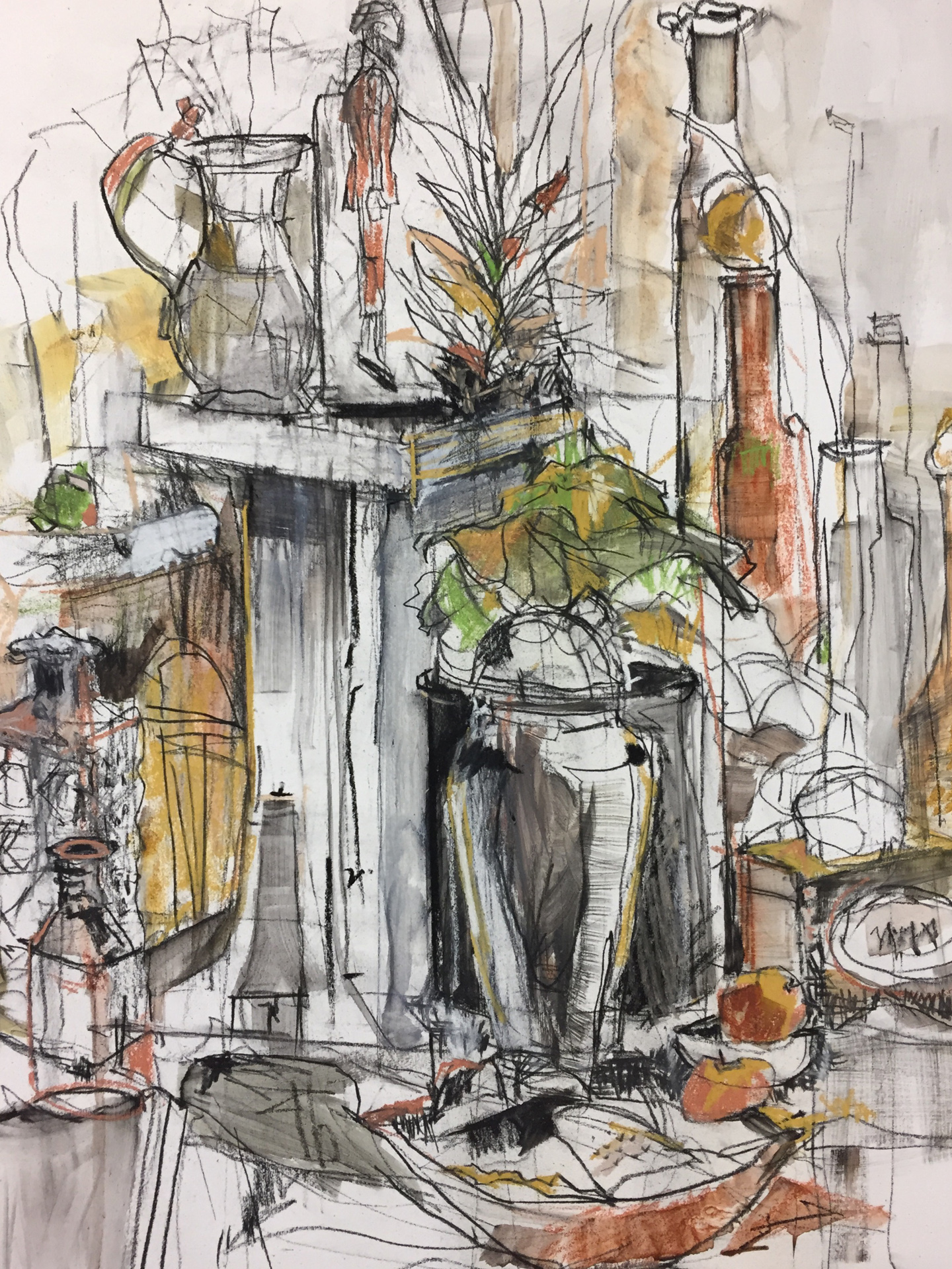 Nancy’s passion for contemporary art is evident in her more recent works on paper, rendering still life, figurative and landscape subjects in her signature intuitive, observational, gestural style, where she uses her favorite materials: acrylics, charcoal, pastels and pasted rice paper elements. The abstracted content of her work reflects her worldwide backpacking travels, summer vacations in Cape Cod and Maine, and her studies in Buddhism.