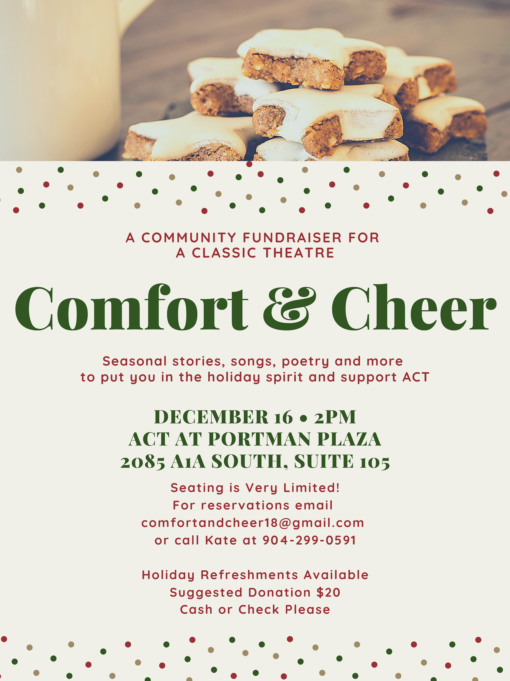 Comfort & Cheer is a theater-community based fundraiser in support of A Classic Theatre. ACT is a non-profit organization dedicated to bringing classic, historic and original works to the St. Augustine theater scene. Recent productions include Intimate Apparel, Lysistrata, Democracy and its Demise, and 1984.