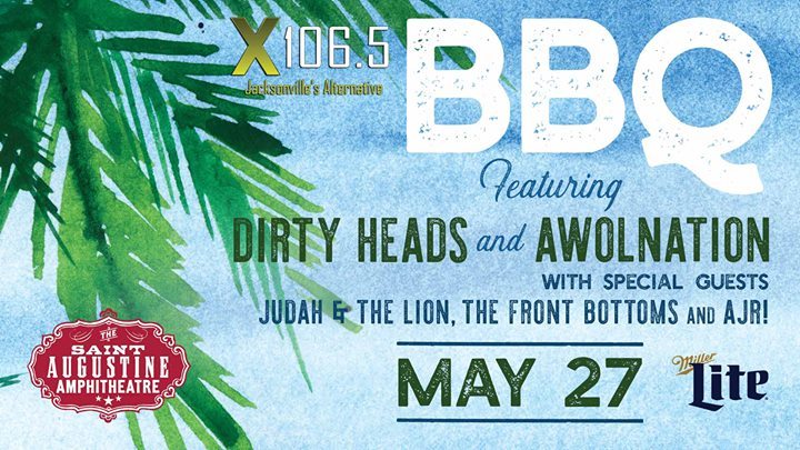 X106.5 Jacksonville’s Alternative will host its “BBQ” featuring five of reggae rock radio’s biggest acts – Dirty Heads and AWOLNATION, Judah & the Lion, The Front Bottoms and AJR – live at the St. Augustine Amphitheatre on Sunday, May 27, 2018. Tickets for X106.5’s “BBQ” go on sale tomorrow, Friday, March 23 at noon.