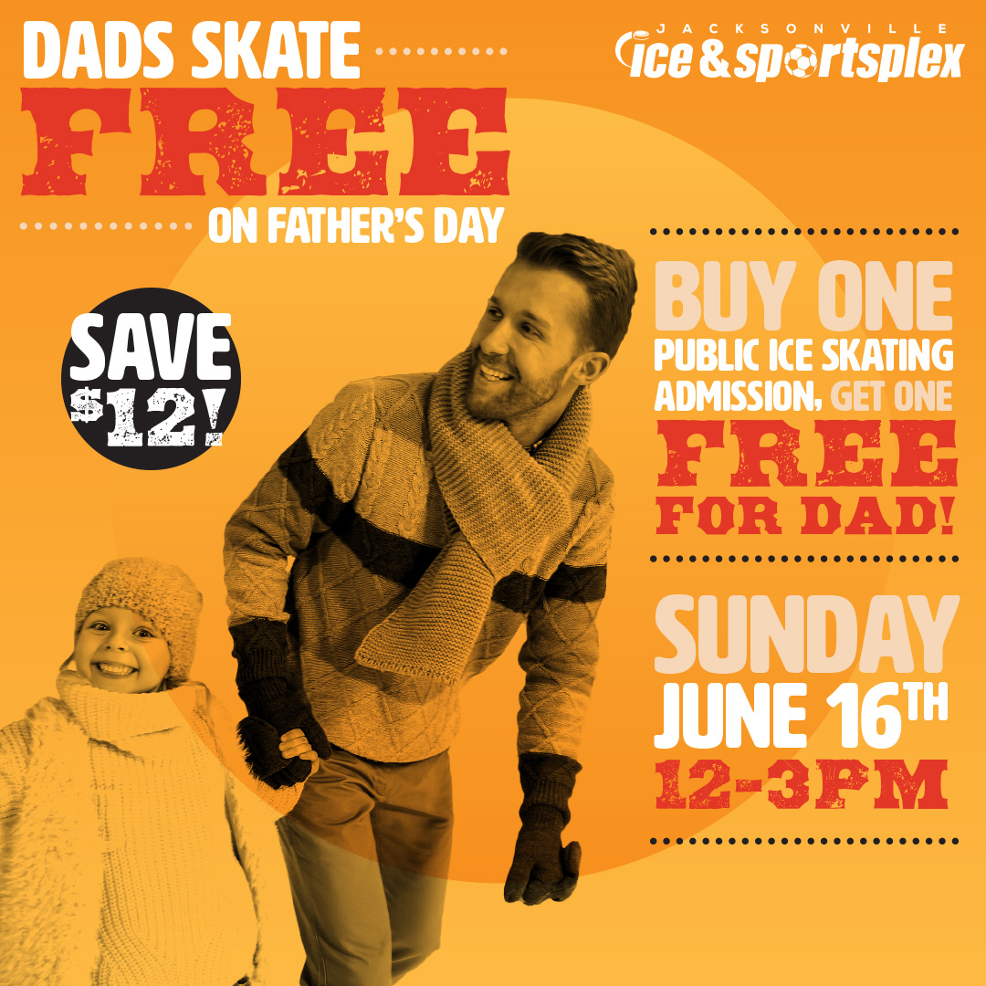 Hey dads, this one is for you! Buy a public skating session and get one for FREE on Father’s Day, June 16th from 12 pm – 3 pm! Celebrate dad and beat the heat with a family fun day at Jacksonville Ice!