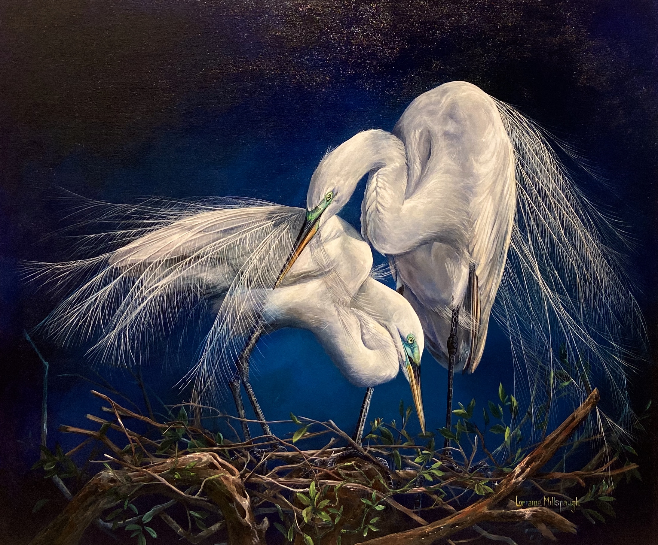 Lorraine’s acrylic paintings of elegant Floridian birds are stunning creations painted with sentiment. She uses mostly acrylic with glazes and molding pastes. She specializes in White Herons, Birds and Beaches, and Sea Turtles swaying to the gentle steering currents of the sea. Her use of vibrant contrasts catch the light in her life-like renderings.