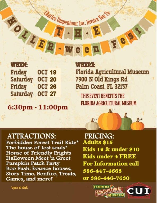 The beloved local event, hosted by the Florida Agricultural Museum, is now the Holler-Ween Festival! Guests can enjoy a haunted house (The Slaughterhouse and the Forbidden Forest Trail Ride), a pumpkin patch, trail rides through the woods, bounce houses, story time in a graveyard, lots of treats and refreshments, and live entertainment. There’s something for the whole family to enjoy a frightful night!