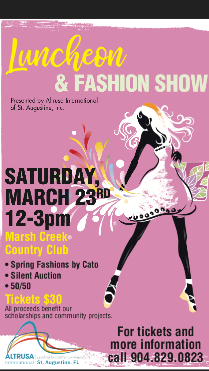 Altrusa’s Luncheon and Fashion Show will be held on March 23rd from 12 – 3 PM at the Marsh Creek Country Club. All proceeds from the show are used to support our scholarship program other community projects.