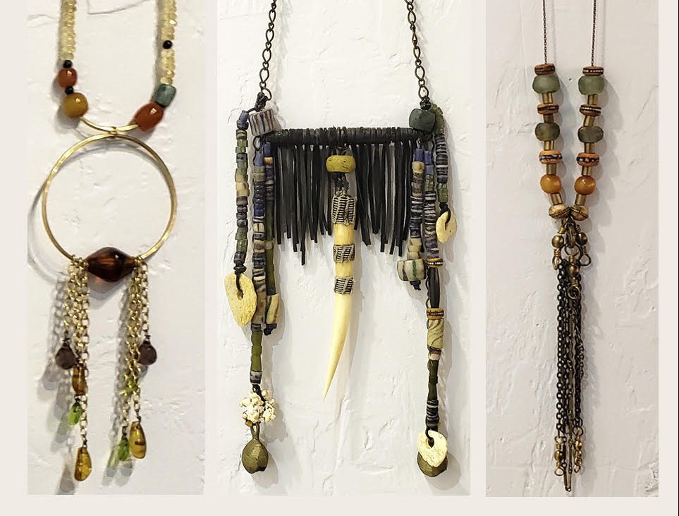 Maureen’s pieces incorporate fine gemstones, chains, fine leathers and especially unique ancient beads from the world over. Her collection highlights plaited leather with embedded stones and various hanging centerpieces creating one of a kind tribal inspired adornments. Many pieces are length adjustable and some can morph into an entirely different design. Truly original, nothing faux about it. No two pieces of her hand crafted jewelry is alike, and has a style unique to Maureen.