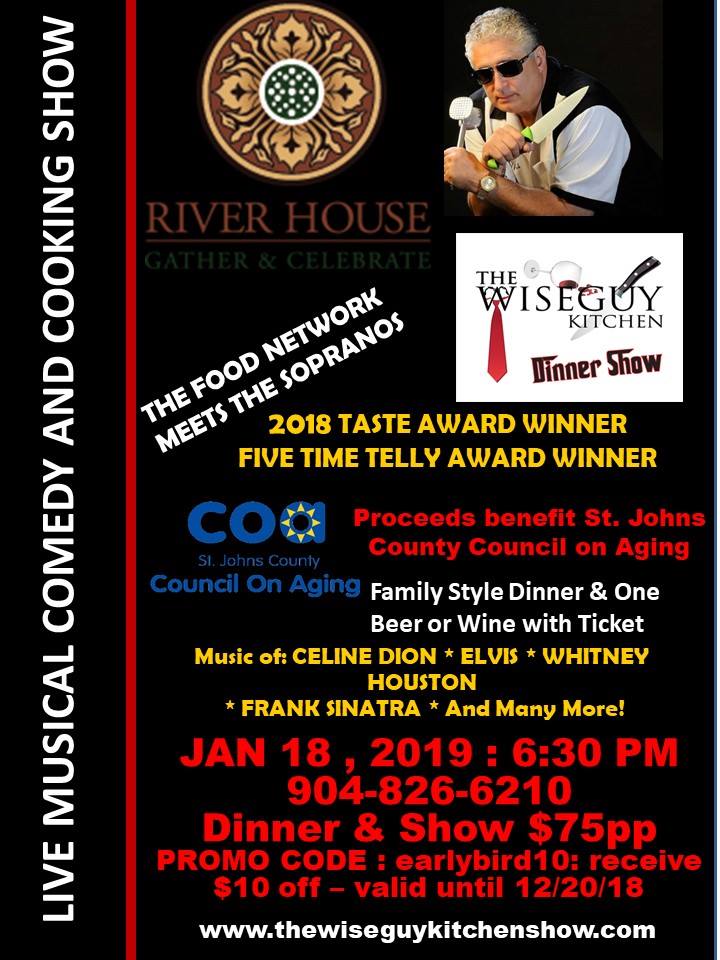 The Food Network meets the Sopranos! This is a live musical and cooking show. 2018 Taste Award Winner and 5 Time Telly Award Winner. Family Style Dinner includes one beer or wine ticket. Dinner and Show $75.00 pp. Proceeds benefit St Johns County Council on Aging. Call for tickets 904-826-6201 or visit www.thewiseguykitchenshow.com