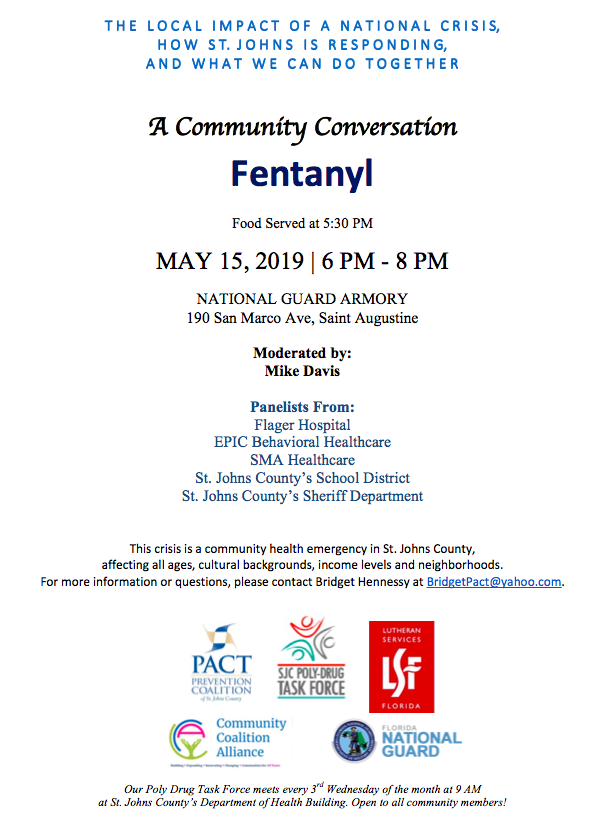 St. Johns County’s Poly Drug Task Force is holding a town hall on May 15th at 6 PM at The Armory on San Marco in St. Augustine concentrating on Fentanyl, the negative impact it has made in our county, and the prevention efforts we are making that community members can become involved in. It’s going to be an amazing, educational event!