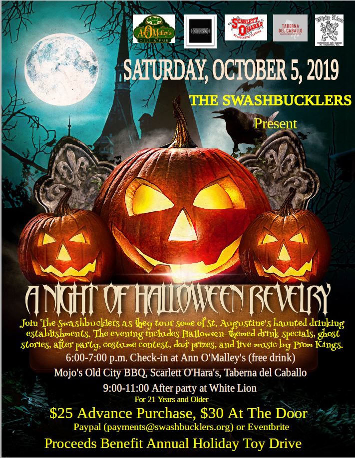 Join The Swashbucklers as they tour some of St. Augustine’s haunted drinking establishments. The evening includes Halloween-themed drink specials, ghost stories, after party, costume contest, door prizes, and live music by Prom Kings. All Proceeds benefit The Swashbucklers annual Holiday Toy Drive.