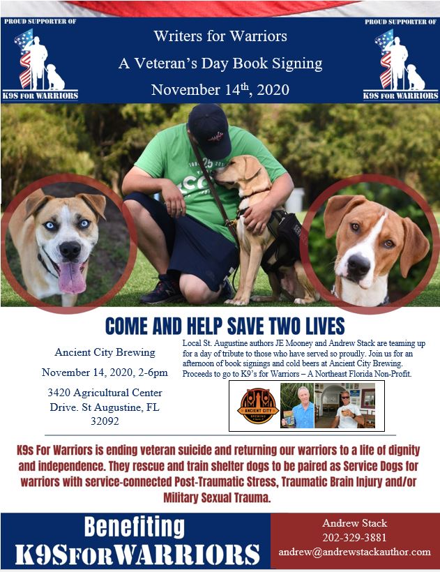 Local St. Augustine authors are teaming together at the Ancient City Brewing brew house to host a special book signing and fundraiser to commemorate Veteran’s Day. The event will support a St. Johns County non-profit called K9s For Warriors. K9s For Warriors pairs disabled American veterans with rescue dogs and trains them to become certified service animals.