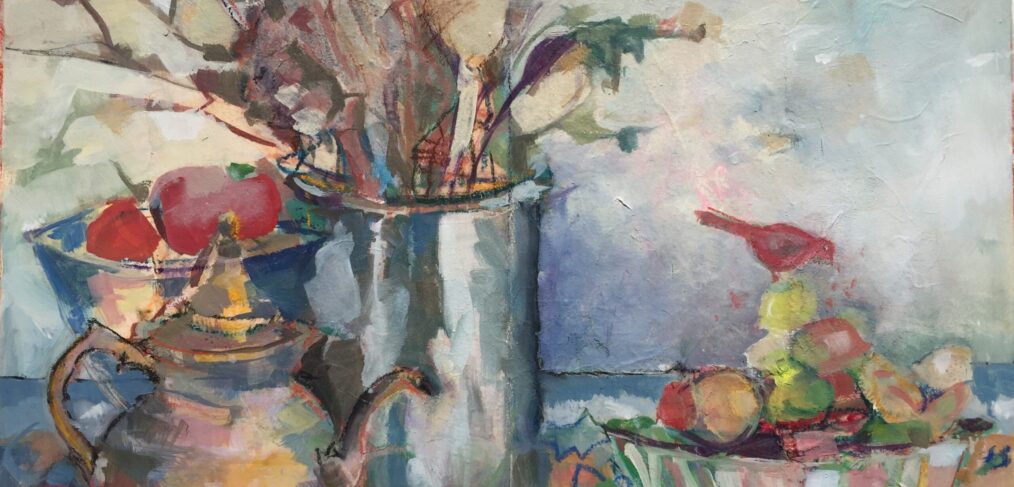 During the past year’s isolation, She became immersed in a still life series, in which studio ephemera and her environment appear in diverse contexts: abstracted, realistic, within an imagined location. Hamlin-Vogler treats her subjects intriguingly, mixing her favorite materials – paints, pastels, collage, and recycled silkscreens – often leaving the viewer hanging by a thread yet satisfied with multiple possibilities.