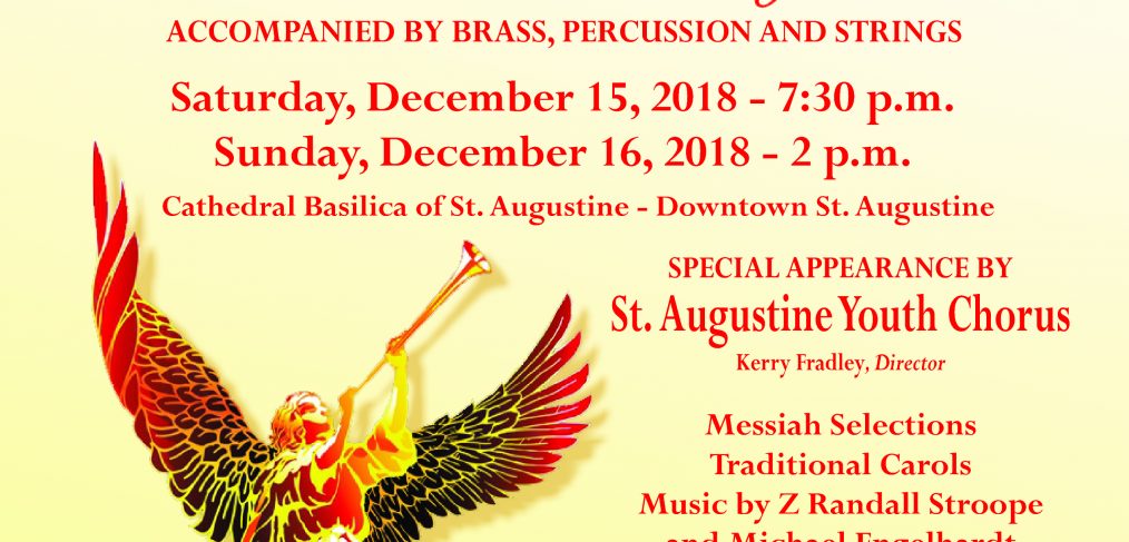 The St. Augustine Community Chorus will be hosting its annual Holiday program on Saturday, Dec 14th at 7:30 pm and Sunday, Dec 15th at 2 pm in the historic Cathedral Basilica downtown. “This Christmastide” event will include a full chorus, chamber orchestra, organ, and many more fantastic musical artists. This spectacular event will be an evening of stunning music as well as featured pieces from The Messiah and traditional Christmas carols for all to enjoy.