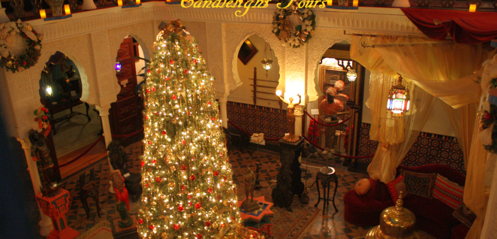 The Villa Zorayda Museum showcases beautiful Christmas decorations for the Holidays. A spectacular Christmas Tree decorated in the colors of the Zorayda – red and gold – is located center stage in the central “Court of Lions”. Over 100 candles are aglow throughout the Museum as docents lead you on your tour of the historic former home. These specialty tours have become one of the most popular things to do during St. Augustine’s Nights of Lights Celebration.