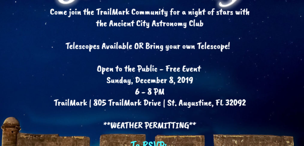 Looking for a free event this weekend that’s family friendly? Come out to TrailMark (right off Pacetti Rd) to do some star gazing! We’re partnering with the St. Augustine Astronomy Club to get en even more in depth look at the stars. Bring your own telescope if you have one, if not no worries! The Astronomy Club is setting up theirs as well. We will also be setting up a Hot Cocoa Bar in the Welcome Center. Parking on site. Hope to see you there! Please RSVP! ***WEATHER PERMITTING***