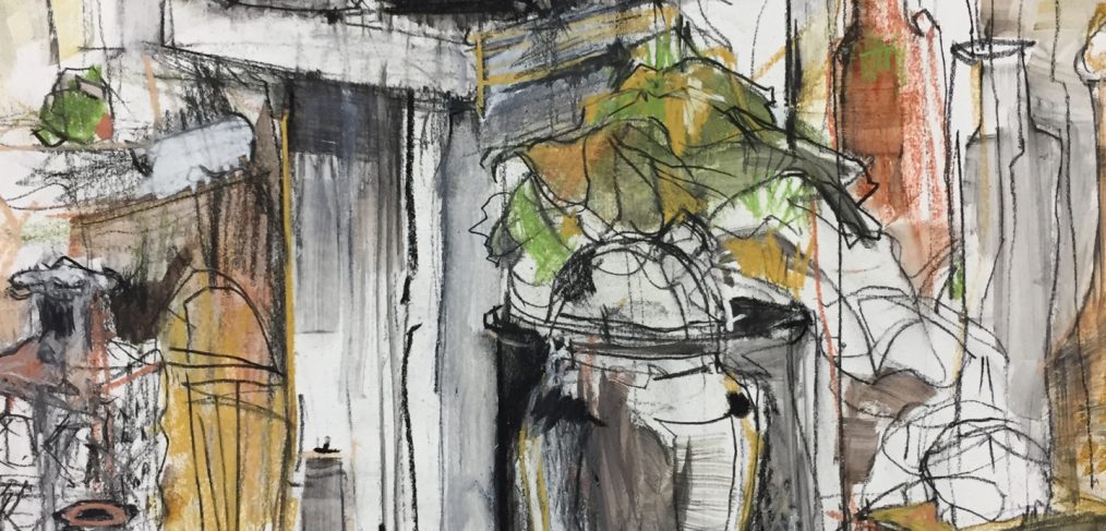 Nancy’s passion for contemporary art is evident in her more recent works on paper, rendering still life, figurative and landscape subjects in her signature intuitive, observational, gestural style, where she uses her favorite materials: acrylics, charcoal, pastels and pasted rice paper elements. The abstracted content of her work reflects her worldwide backpacking travels, summer vacations in Cape Cod and Maine, and her studies in Buddhism.
